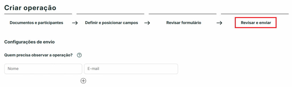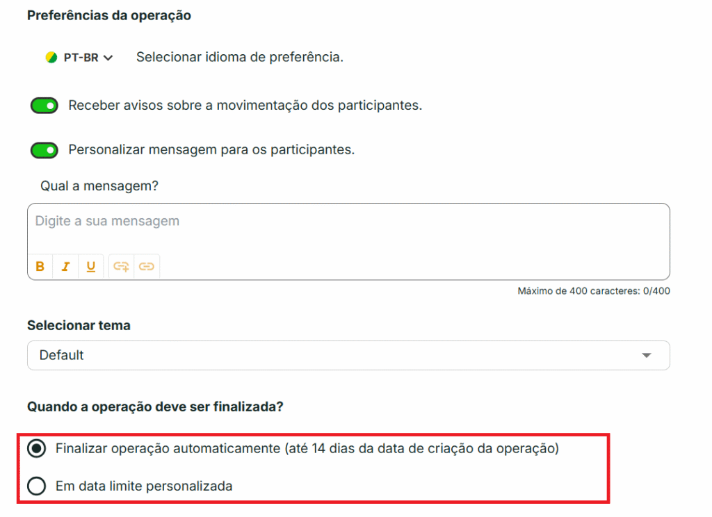 Para configurar o momento em que sua operação deve ser finalizada, siga estes passos: crie sua operação normalmente como de costume e, na etapa “Revisar e enviar“, escolha a opção “Manualmente ou em data limite personalizada“. Em seguida, configure a data e hora.