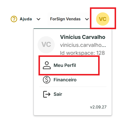 1. Clique nas inicias do seu nome no canto superior direito da página e em seguida em Meu Perfil