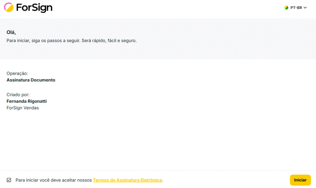 Para iniciar, confira as informações da operação e aceite os termos da Assinatura Eletrônica.