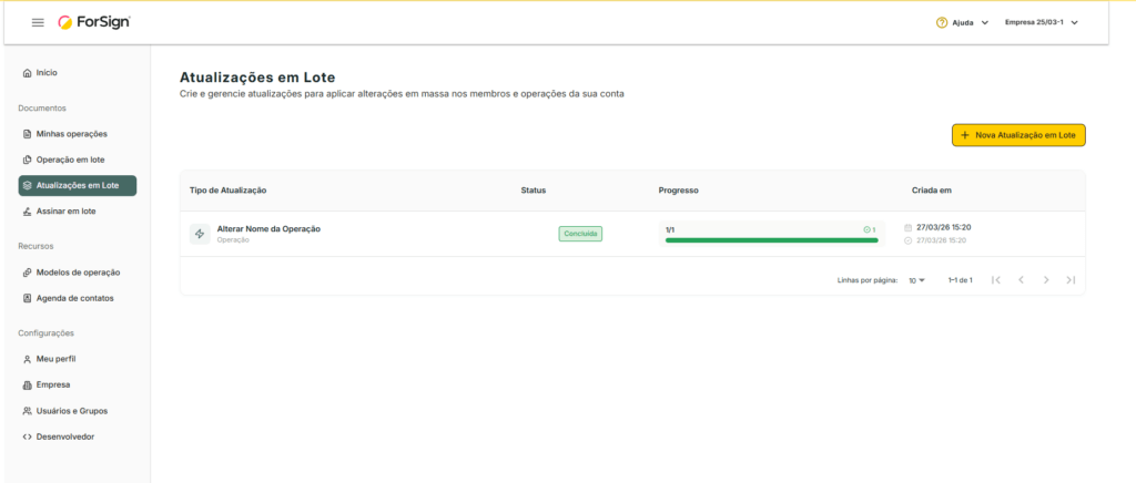Importante: O campo Status da Operação só oferece o valor “Em Andamento”. Isso significa que as atualizações em lote se aplicam apenas a operações ativas. Operações concluídas, canceladas ou expiradas são excluídas automaticamente.