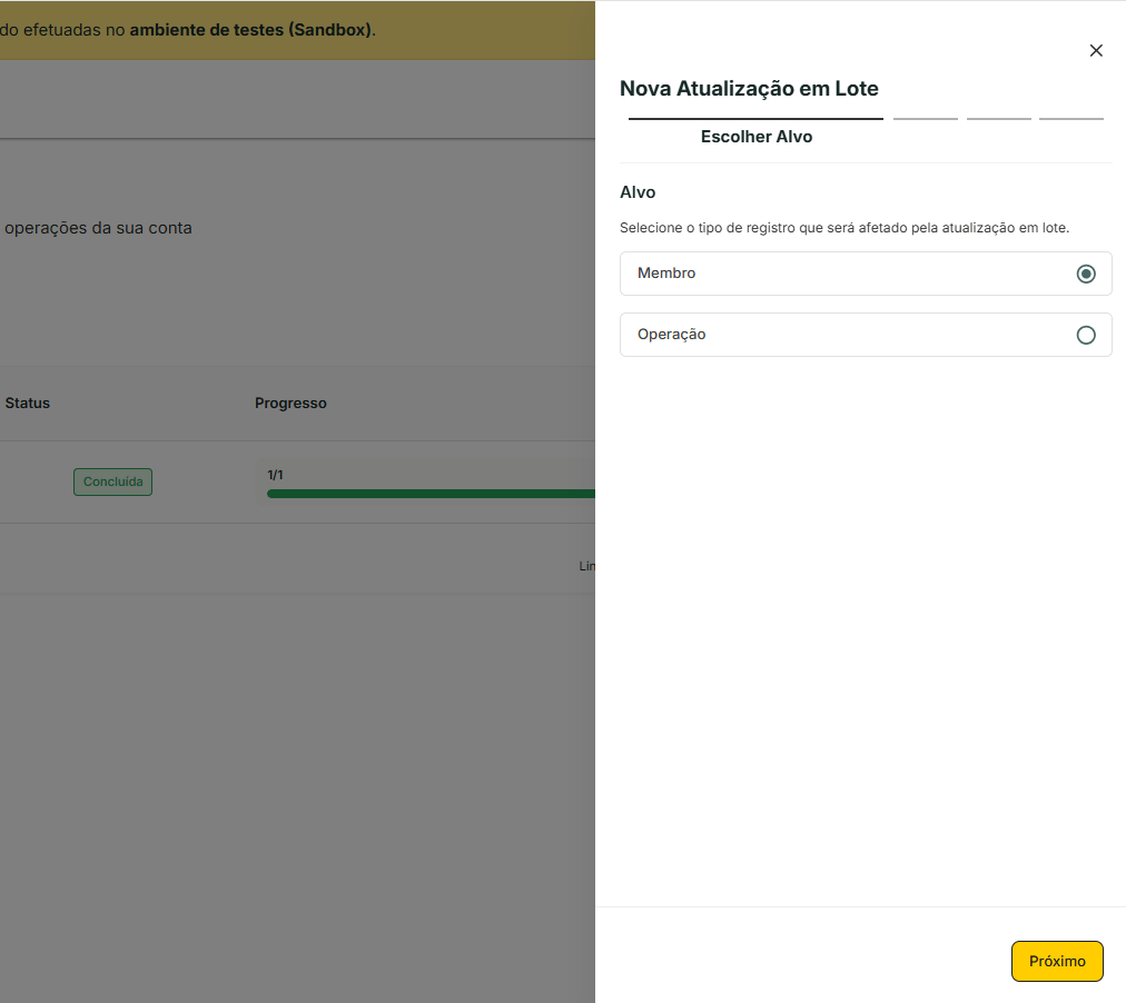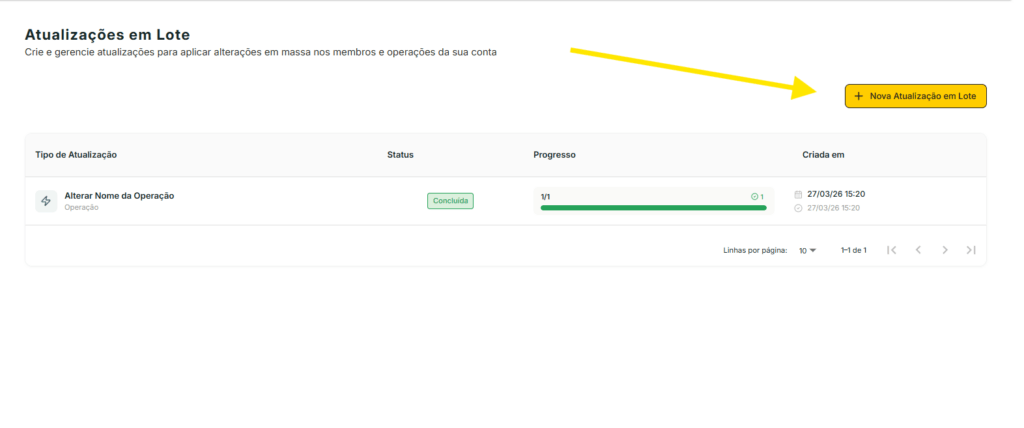 A funcionalidade Atualizações em Lote permite criar e executar ações em massa sobre membros (participantes de operações) e operações da sua conta, sem precisar editar cada registro individualmente. Com ela você define filtros para selecionar os registros desejados e aplica uma ação sobre todos de uma só vez.