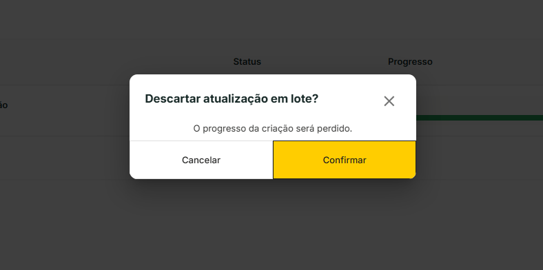 - ⚠️ Alerta: “Esta atualização não pode ser desfeita. Verifique os registros afetados antes de confirmar.”
