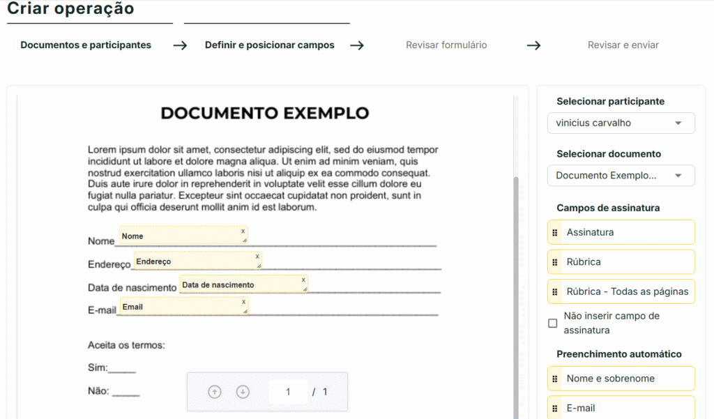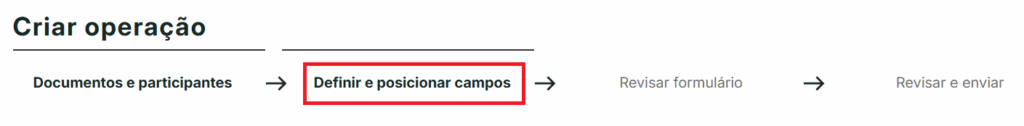 Antes de começar a criar o formulário, é necessário criar uma operação. Na etapa de “Definir e posicionar os campos“, você posicionar os campos do formulário arrastando-os para o local onde deseja que as informações apareçam no seu documento. Após definir todos os campos dentro do documento, para prosseguir clique no botão continuar.