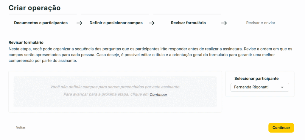 Durante a etapa “Revisar Formulário“, é importante verificar se todos os campos do formulário foram configurados corretamente para que o signatário (quem assina) possa preenchê-los durante o fluxo de assinatura. Antes de prosseguir, revise atentamente e garanta uma experiência agradável.