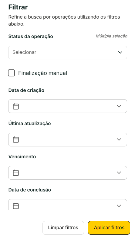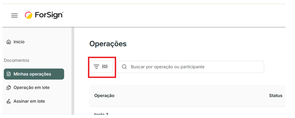 Antes de buscar, clique “Minhas Operações” no menu lateral esquerdo e depois no ícone do filtro para escolher dentre várias opções para encontrar o que procura.