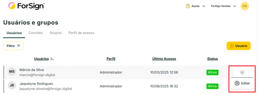 Ao lado do e-mail de cada usuário será exibido o nível de acesso que ele possui e você poderá alterá-lo. Os níveis são: