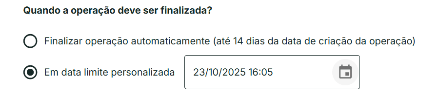 2) Manualmente ou em data limite personalizada: Na etapa “Revisar e enviar” ao selecionar esta opção, sua operação será finalizada na data e na hora que você configurou ou ao clicar no botão “Finalizar operação”.