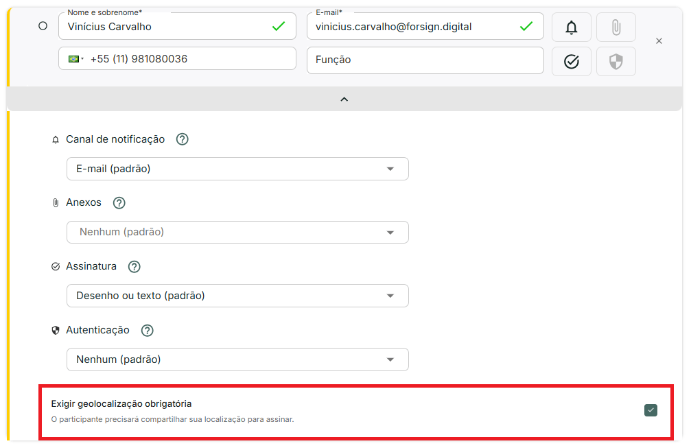 É possível definir a obrigatoriedade da geolocalização durante a criação da operação. Para isso, basta abrir a aba de personalização do signatário que deseja exigir a obrigatoriedade e selecionar essa exigência.