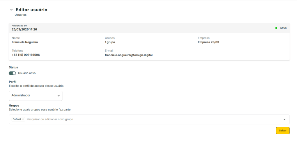 Essa área permite visualizar, adicionar e editar usuários da empresa.
