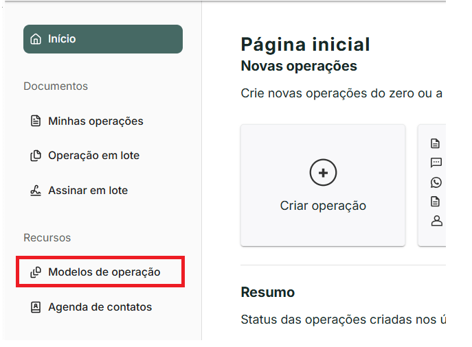 2. No menu lateral e clique na opção “Modelos de operação“, em seguida, na lateral direita, clique na opção “Novo Modelo” para adicionar o(s) documento(s) no formato PDF e preencha os seguintes campos obrigatórios: