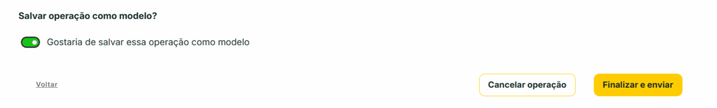 1. Crie uma operação igualmente como você já realiza hoje –Criar operação-, e no final da última página antes de enviar a sua operação, ative a opção “Gostaria de salvar essa operação como modelo”.